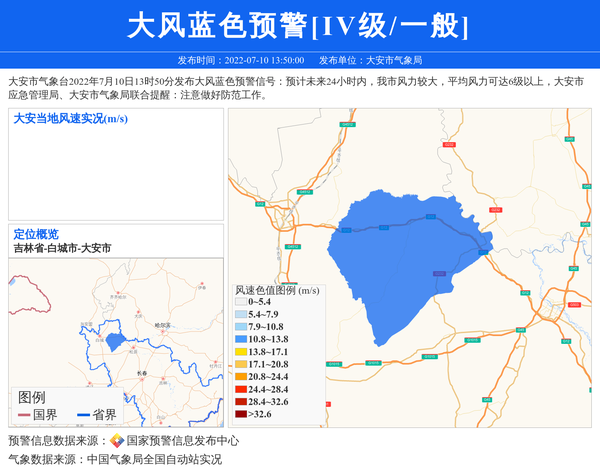 大安市气象台2022年7月10日13时50分发布大风蓝色预警信号:预计未来24小时内,我市风力较大,平均风力可达6级以上,大安市应急管理局、大安市气象局联合提醒:注意做好防范工作。 信息来源:国家预警信息发布中心; 发布单位:大安市气象局。