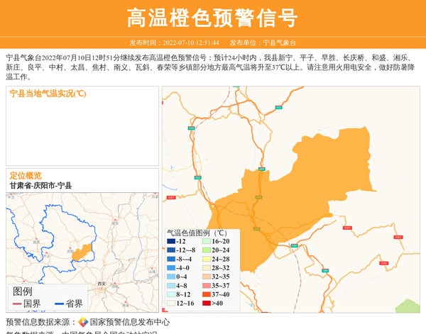 宁县气象台2022年07月10日12时51分继续发布高温橙色预警信号:预计24小时内,我县新宁、平子、早胜、长庆桥、和盛、湘乐、新庄、良平、中村、太昌、焦村、南义、瓦斜、春荣等乡镇部分地方最高气温将升至37℃以上。请注意用火用电安全,做好防暑降温工作。 信息来源:国家预警信息发布中心; 发布单位:宁县气象台。