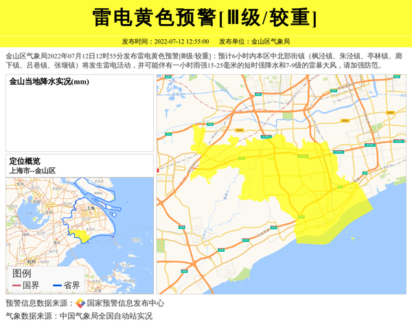 金山区气象局2022年07月12日12时55分发布雷电黄色预警[Ⅲ级/较重]:预计6小时内本区中北部街镇(枫泾镇、朱泾镇、亭林镇、廊下镇、吕巷镇、张堰镇)将发生雷电活动,并可能伴有一小时雨强15-25毫米的短时强降水和7-9级的雷暴大风,请加强防范。 信息来源:国家预警信息发布中心; 发布单位:金山区气象局。