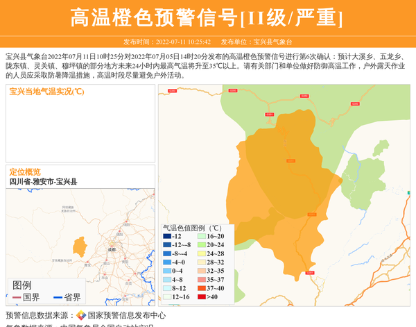 宝兴县气象台2022年07月11日10时25分对2022年07月05日14时20分发布的高温橙色预警信号进行第6次确认:预计大溪乡、五龙乡、陇东镇、灵关镇、穆坪镇的部分地方未来24小时内最高气温将升至35℃以上。请有关部门和单位做好防御高温工作,户外露天作业的人员应采取防暑降温措施,高温时段尽量避免户外活动。 信息来源:国家预警信息发布中心; 发布单位:宝兴县气象台。