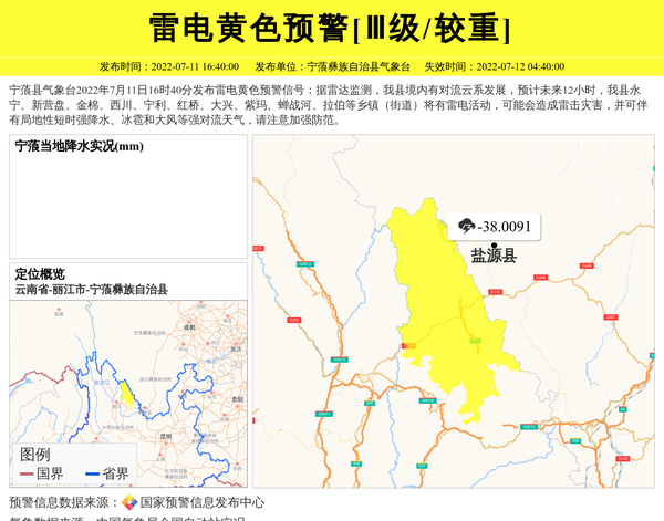 宁蒗县气象台2022年7月11日16时40分发布雷电黄色预警信号:据雷达监测,我县境内有对流云系发展,预计未来12小时,我县永宁、新营盘、金棉、西川、宁利、红桥、大兴、紫玛、蝉战河、拉伯等乡镇(街道)将有雷电活动,可能会造成雷击灾害,并可伴有局地性短时强降水、冰雹和大风等强对流天气,请注意加强防范。 信息来源:国家预警信息发布中心; 发布单位:宁蒗彝族自治县气象台。