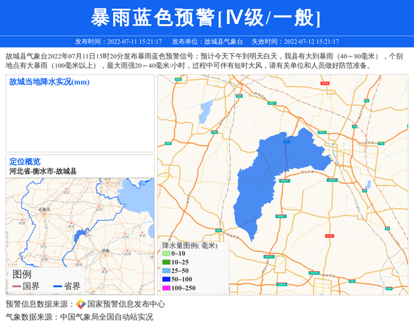 故城县气象台2022年07月11日15时20分发布暴雨蓝色预警信号:预计今天下午到明天白天,我县有大到暴雨(40~80毫米),个别地点有大暴雨(100毫米以上),最大雨强20~40毫米/小时,过程中可伴有短时大风,请有关单位和人员做好防范准备。 信息来源:国家预警信息发布中心; 发布单位:故城县气象台。
