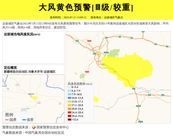 达坂城区气象台2022年7月11日13时9分发布大风黄色预警信号:预计今天白天到13号夜间达坂城区大部分区域将受大风影响,平均风力5-6级,阵风8-9级,局地伴有沙尘,建议防范。 信息来源:国家预警信息发布中心; 发布单位:达坂城区气象台。