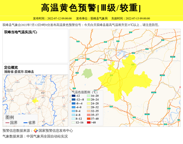 双峰县气象台2022年7月12日9时0分发布高温黄色预警信号:今天白天双峰县最高气温将升至35℃以上,请注意防范。 信息来源:国家预警信息发布中心; 发布单位:双峰县气象局。