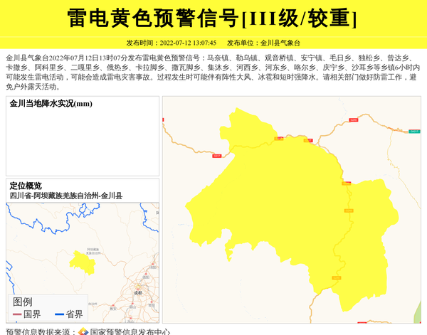 金川县气象台2022年07月12日13时07分发布雷电黄色预警信号:马奈镇、勒乌镇、观音桥镇、安宁镇、毛日乡、独松乡、曾达乡、卡撒乡、阿科里乡、二嘎里乡、俄热乡、卡拉脚乡、撒瓦脚乡、集沐乡、河西乡、河东乡、咯尔乡、庆宁乡、沙耳乡等乡镇6小时内可能发生雷电活动,可能会造成雷电灾害事故。过程发生时可能伴有阵性大风、冰雹和短时强降水。请相关部门做好防雷工作,避免户外露天活动。 信息来源:国家预警信息发布中心; 发布单位:金川县气象台。
