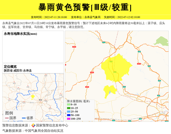 永寿县气象台2022年07月11日20时10分发布暴雨黄色预警信号:预计下述地区未来6小时内降雨量将达50毫米以上:渠子镇、店头镇、监军街道、甘井镇、马坊镇、常宁镇、永平镇,请注意防范。 信息来源:国家预警信息发布中心; 发布单位:永寿县气象局。