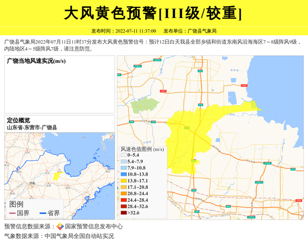 广饶县气象局2022年07月11日11时37分发布大风黄色预警信号:预计12日白天我县全部乡镇和街道东南风沿海海区7~8级阵风9级,内陆地区4~5级阵风7级,请注意防范。 信息来源:国家预警信息发布中心; 发布单位:广饶县气象局。