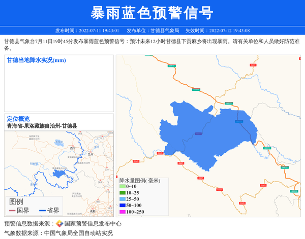 甘德县气象台7月11日19时45分发布暴雨蓝色预警信号:预计未来12小时甘德县下贡麻乡将出现暴雨。请有关单位和人员做好防范准备。 信息来源:国家预警信息发布中心; 发布单位:甘德县气象局。