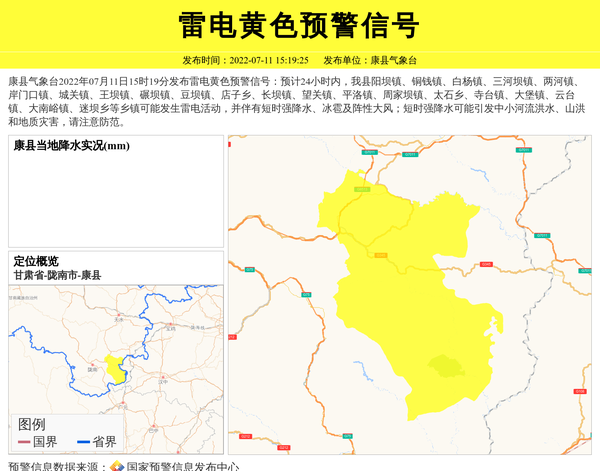 康县气象台2022年07月11日15时19分发布雷电黄色预警信号:预计24小时内,我县阳坝镇、铜钱镇、白杨镇、三河坝镇、两河镇、岸门口镇、城关镇、王坝镇、碾坝镇、豆坝镇、店子乡、长坝镇、望关镇、平洛镇、周家坝镇、太石乡、寺台镇、大堡镇、云台镇、大南峪镇、迷坝乡等乡镇可能发生雷电活动,并伴有短时强降水、冰雹及阵性大风;短时强降水可能引发中小河流洪水、山洪和地质灾害,请注意防范。 信息来源:国家预警信息发布中心; 发布单位:康县气象台。