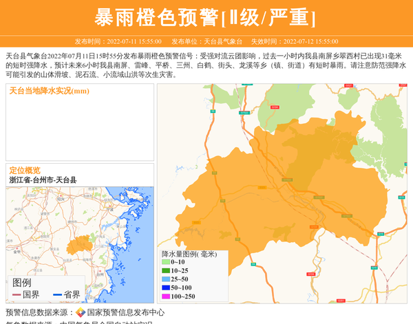 天台县气象台2022年07月11日15时55分发布暴雨橙色预警信号:受强对流云团影响,过去一小时内我县南屏乡翠西村已出现31毫米的短时强降水,预计未来6小时我县南屏、雷峰、平桥、三州、白鹤、街头、龙溪等乡(镇、街道)有短时暴雨。请注意防范强降水可能引发的山体滑坡、泥石流、小流域山洪等次生灾害。 信息来源:国家预警信息发布中心; 发布单位:天台县气象台。