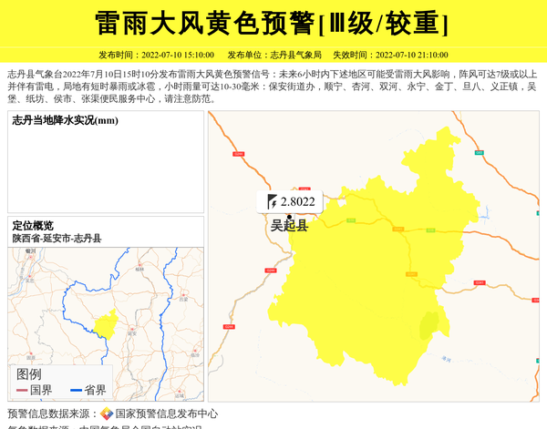 志丹县气象台2022年7月10日15时10分发布雷雨大风黄色预警信号:未来6小时内下述地区可能受雷雨大风影响,阵风可达7级或以上并伴有雷电,局地有短时暴雨或冰雹,小时雨量可达10-30毫米:保安街道办,顺宁、杏河、双河、永宁、金丁、旦八、义正镇,吴堡、纸坊、侯市、张渠便民服务中心,请注意防范。 信息来源:国家预警信息发布中心; 发布单位:志丹县气象局。