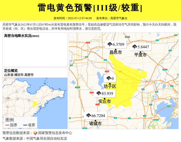 高密市气象台2022年07月12日07时46分发布雷电黄色预警信号:受副高边缘暖湿气流和冷空气共同影响,预计今天白天到夜间,我市各镇(街、区)将出现雷电活动,并伴有局地短时强降水,请注意防范。 信息来源:国家预警信息发布中心; 发布单位:高密市气象台。