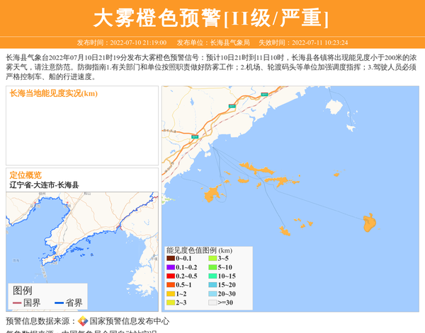 长海县气象台2022年07月10日21时19分发布大雾橙色预警信号:预计10日21时到11日10时,长海县各镇将出现能见度小于200米的浓雾天气,请注意防范。防御指南1.有关部门和单位按照职责做好防雾工作;2.机场、轮渡码头等单位加强调度指挥;3.驾驶人员必须严格控制车、船的行进速度。 信息来源:国家预警信息发布中心; 发布单位:长海县气象局。