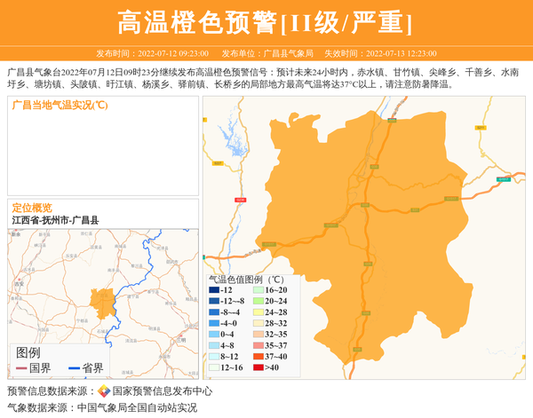 广昌县气象台2022年07月12日09时23分继续发布高温橙色预警信号:预计未来24小时内,赤水镇、甘竹镇、尖峰乡、千善乡、水南圩乡、塘坊镇、头陂镇、旴江镇、杨溪乡、驿前镇、长桥乡的局部地方最高气温将达37°C以上,请注意防暑降温。 信息来源:国家预警信息发布中心; 发布单位:广昌县气象局。
