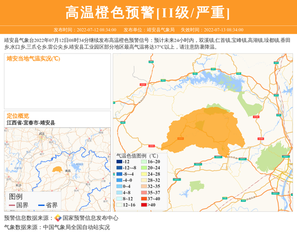 靖安县气象台2022年07月12日08时34分继续发布高温橙色预警信号:预计未来24小时内,双溪镇,仁首镇,宝峰镇,高湖镇,璪都镇,香田乡,水口乡,三爪仑乡,雷公尖乡,靖安县工业园区部分地区最高气温将达37°C以上,请注意防暑降温。 信息来源:国家预警信息发布中心; 发布单位:靖安县气象局。