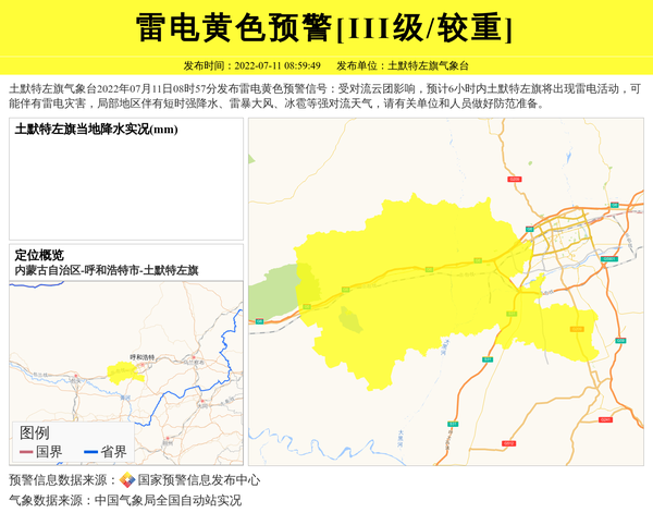 土默特左旗气象台2022年07月11日08时57分发布雷电黄色预警信号:受对流云团影响,预计6小时内土默特左旗将出现雷电活动,可能伴有雷电灾害,局部地区伴有短时强降水、雷暴大风、冰雹等强对流天气,请有关单位和人员做好防范准备。 信息来源:国家预警信息发布中心; 发布单位:土默特左旗气象台。