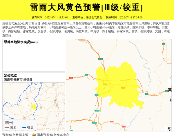 绥德县气象台2022年07月11日11时35分继续发布雷雨大风黄色预警信号:未来6小时内下述地区可能受雷雨大风影响,阵风可达7级或以上并伴有雷电,局地短时暴雨,小时雨量可达40毫米以上,最大小时雨强40-60毫米:定仙墕镇、薛家峁镇、枣林坪镇、田庄镇、白家硷镇、张家砭镇、义合镇、石家湾镇、名州镇、满堂川镇、中角镇、四十铺镇、薛家河镇、吉镇、崔家湾镇、艽园,请注意防范。 信息来源:国家预警信息发布中心; 发布单位:绥德县气象台。