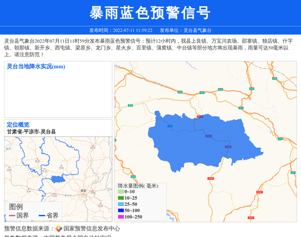 灵台县气象台2022年07月11日11时59分发布暴雨蓝色预警信号:预计12小时内,我县上良镇、万宝川农场、邵寨镇、独店镇、什字镇、朝那镇、新开乡、西屯镇、梁原乡、龙门乡、星火乡、百里镇、蒲窝镇、中台镇等部分地方将出现暴雨,雨量可达50毫米以上。请注意防范! 信息来源:国家预警信息发布中心; 发布单位:灵台县气象台。