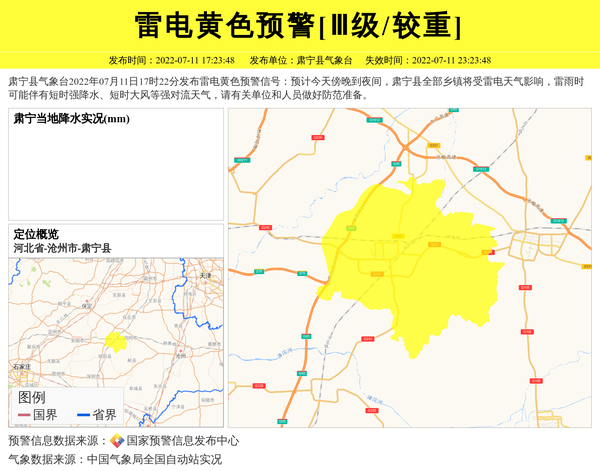 肃宁县气象台2022年07月11日17时22分发布雷电黄色预警信号:预计今天傍晚到夜间,肃宁县全部乡镇将受雷电天气影响,雷雨时可能伴有短时强降水、短时大风等强对流天气,请有关单位和人员做好防范准备。 信息来源:国家预警信息发布中心; 发布单位:肃宁县气象台。