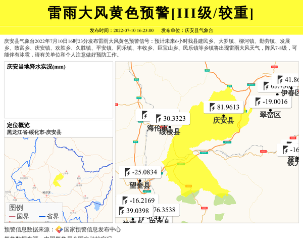 庆安县气象台2022年7月10日16时23分发布雷雨大风黄色预警信号:预计未来6小时我县建民乡、大罗镇、柳河镇、勤劳镇、发展乡、致富乡、庆安镇、欢胜乡、久胜镇、平安镇、同乐镇、丰收乡、巨宝山乡、民乐镇等乡镇将出现雷雨大风天气,阵风7-8级,可能伴有冰雹,请有关单位和个人注意做好预防工作。 信息来源:国家预警信息发布中心; 发布单位:庆安县气象台。