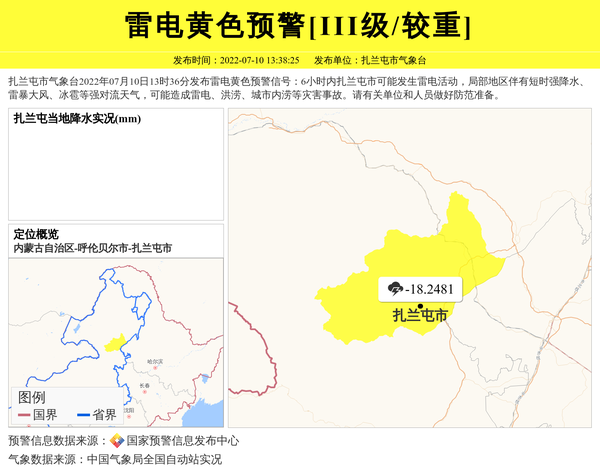 扎兰屯市气象台2022年07月10日13时36分发布雷电黄色预警信号:6小时内扎兰屯市可能发生雷电活动,局部地区伴有短时强降水、雷暴大风、冰雹等强对流天气,可能造成雷电、洪涝、城市内涝等灾害事故。请有关单位和人员做好防范准备。 信息来源:国家预警信息发布中心; 发布单位:扎兰屯市气象台。