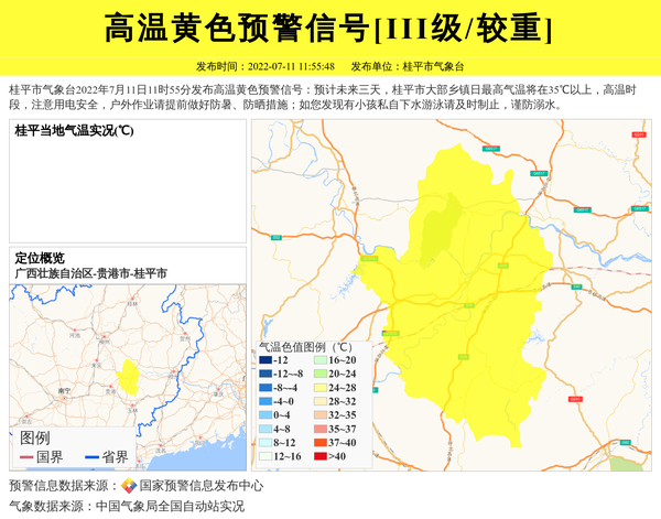桂平市气象台2022年7月11日11时55分发布高温黄色预警信号:预计未来三天,桂平市大部乡镇日最高气温将在35℃以上,高温时段,注意用电安全,户外作业请提前做好防暑、防晒措施;如您发现有小孩私自下水游泳请及时制止,谨防溺水。 信息来源:国家预警信息发布中心; 发布单位:桂平市气象台。