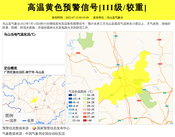 马山县气象台2022年7月12日8时55分继续发布高温黄色预警信号:预计未来三天马山县最高气温将在35度以上。天气炎热,请做好防暑、防晒、防溺水措施;并做好森林火灾及电路火灾的防范工作。 信息来源:国家预警信息发布中心; 发布单位:马山县气象台。