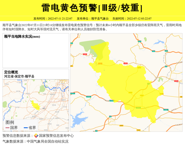 顺平县气象台2022年07月11日21时18分继续发布雷电黄色预警信号:预计未来6小时内顺平县全部乡镇仍有雷阵雨天气,雷雨时局地伴有短时强降水、短时大风等强对流天气,请有关单位和人员做好防范准备。 信息来源:国家预警信息发布中心; 发布单位:顺平县气象台。