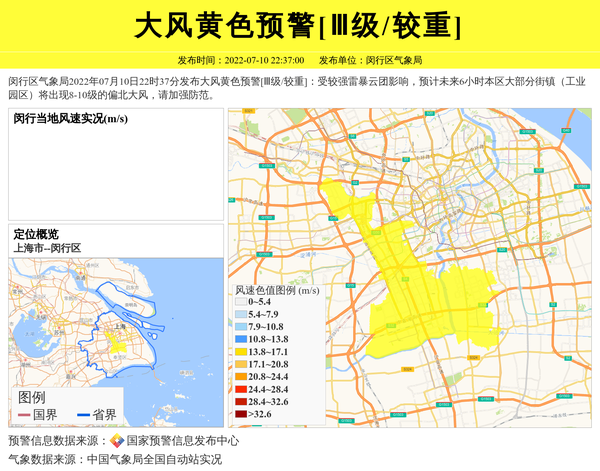 闵行区气象局2022年07月10日22时37分发布大风黄色预警[Ⅲ级/较重]:受较强雷暴云团影响,预计未来6小时本区大部分街镇(工业园区)将出现8-10级的偏北大风,请加强防范。 信息来源:国家预警信息发布中心; 发布单位:闵行区气象局。