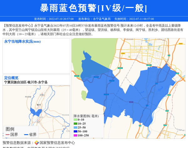 【预警信息发布中心】永宁县气象台2022年07月10日20时57分发布暴雨蓝色预警信号:预计未来12小时,全县有中雨及以上量级降水,其中贺兰山闽宁镇沿山段有大到暴雨(25~40毫米),望远镇、望洪镇、杨和镇、李俊镇、闽宁镇、胜利乡、团结西路街道有中到大雨(10~25毫米),请相关部门和社会公众注意做好预防。 信息来源:国家预警信息发布中心; 发布单位:永宁县气象局。