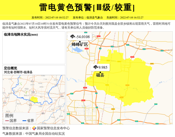 临漳县气象台2022年07月10日10时51分发布雷电黄色预警信号:预计今天白天到夜间我县全部乡镇将出现雷雨天气,雷雨时局地可能伴有短时强降水、短时大风等强对流天气,请有关单位和人员做好防范准备。 信息来源:国家预警信息发布中心; 发布单位:临漳县气象台。