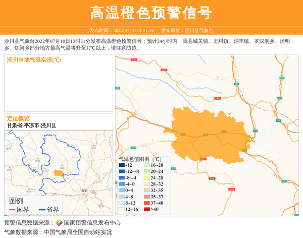 泾川县气象台2022年07月10日13时31分发布高温橙色预警信号:预计24小时内,我县城关镇、王村镇、汭丰镇、罗汉洞乡、泾明乡、红河乡部分地方最高气温将升至37℃以上,请注意防范。 信息来源:国家预警信息发布中心; 发布单位:泾川县气象台。