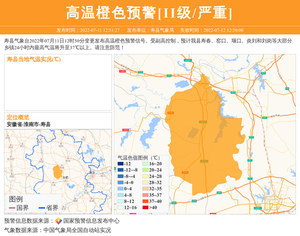 寿县气象台2022年07月11日12时50分变更发布高温橙色预警信号。受副高控制,预计我县寿春、窑口、堰口、炎刘和刘岗等大部分乡镇24小时内最高气温将升至37℃以上。请注意防范! 信息来源:国家预警信息发布中心; 发布单位:寿县气象局。