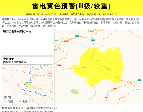 略阳县气象台2022年07月14日04时25分发布雷雨大风黄色预警信号:预计未来6小时内下述地区可能受雷雨大风影响,阵风可达7级或以上并伴有雷电,局地短时暴雨,小时雨量可达10毫米以上:兴州街道办、横现河街道办、接官亭镇、白雀寺镇、郭镇、白水江镇、乐素河镇、马蹄湾镇、五龙洞镇,请注意防范。 信息来源:国家预警信息发布中心; 发布单位:略阳县气象台。