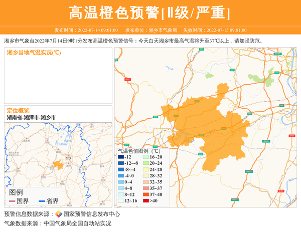 湘乡市气象台2022年7月14日9时1分发布高温橙色预警信号:今天白天湘乡市最高气温将升至37℃以上,请加强防范。 信息来源:国家预警信息发布中心; 发布单位:湘乡市气象局。