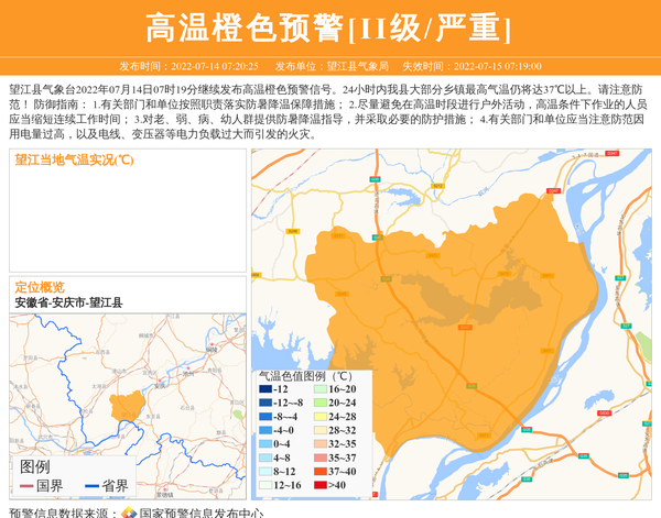 望江县气象台2022年07月14日07时19分继续发布高温橙色预警信号。24小时内我县大部分乡镇最高气温仍将达37℃以上。请注意防范! 防御指南: 1.有关部门和单位按照职责落实防暑降温保障措施; 2.尽量避免在高温时段进行户外活动,高温条件下作业的人员应当缩短连续工作时间; 3.对老、弱、病、幼人群提供防暑降温指导,并采取必要的防护措施; 4.有关部门和单位应当注意防范因用电量过高,以及电线、变压器等电力负载过大而引发的火灾。 信息来源:国家预警信息发布中心; 发布单位:望江县气象局。