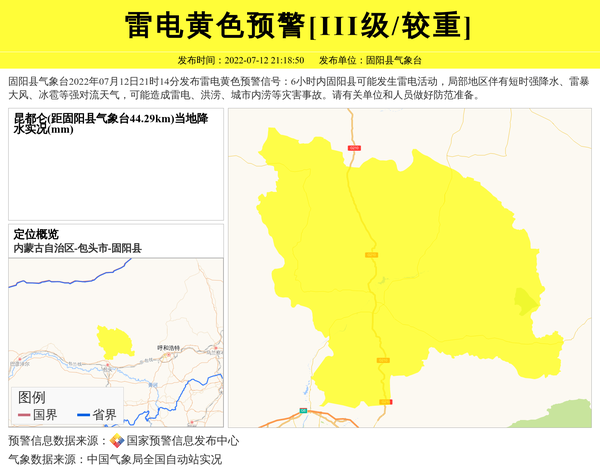 固阳县气象台2022年07月12日21时14分发布雷电黄色预警信号:6小时内固阳县可能发生雷电活动,局部地区伴有短时强降水、雷暴大风、冰雹等强对流天气,可能造成雷电、洪涝、城市内涝等灾害事故。请有关单位和人员做好防范准备。 信息来源:国家预警信息发布中心; 发布单位:固阳县气象台。