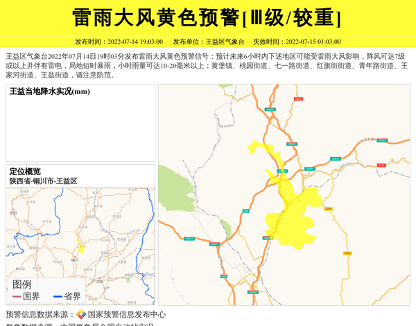 王益区气象台2022年07月14日19时03分发布雷雨大风黄色预警信号:预计未来6小时内下述地区可能受雷雨大风影响,阵风可达7级或以上并伴有雷电,局地短时暴雨,小时雨量可达10-20毫米以上:黄堡镇、桃园街道、七一路街道、红旗街街道、青年路街道、王家河街道、王益街道,请注意防范。 信息来源:国家预警信息发布中心; 发布单位:王益区气象台。