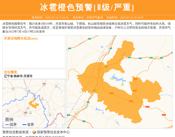 冰雹橙色预警信号:预计未来1到3小时,开原市靠山镇、下肥镇、松山镇等南部乡镇将出现冰雹天气,同时可能伴有短时大风、强降水等强对流天气,并可能造成雹灾,应妥善保护易受冰雹袭击的室外物品或者设备,户外行人立即到安全的地方暂避。开原市气象台2022年7月14日17时22分发布 信息来源:国家预警信息发布中心; 发布单位:开原市气象局。
