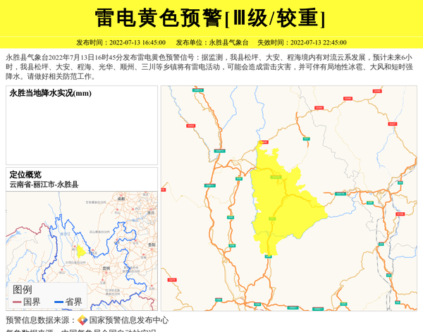 永胜县气象台2022年7月13日16时45分发布雷电黄色预警信号:据监测,我县松坪、大安、程海境内有对流云系发展,预计未来6小时,我县松坪、大安、程海、光华、顺州、三川等乡镇将有雷电活动,可能会造成雷击灾害,并可伴有局地性冰雹、大风和短时强降水。请做好相关防范工作。 信息来源:国家预警信息发布中心; 发布单位:永胜县气象台。