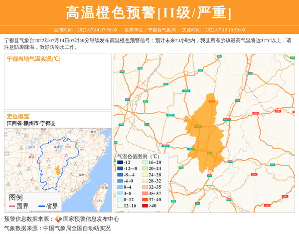 宁都县气象台2022年07月14日07时50分继续发布高温橙色预警信号:预计未来24小时内,我县所有乡镇最高气温将达37°C以上,请注意防暑降温,做好防溺水工作。 信息来源:国家预警信息发布中心; 发布单位:宁都县气象局。