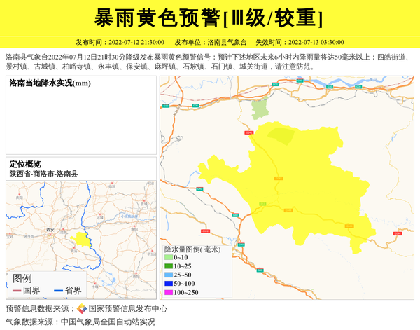 洛南县气象台2022年07月12日21时30分降级发布暴雨黄色预警信号:预计下述地区未来6小时内降雨量将达50毫米以上:四皓街道、景村镇、古城镇、柏峪寺镇、永丰镇、保安镇、麻坪镇、石坡镇、石门镇、城关街道,请注意防范。 信息来源:国家预警信息发布中心; 发布单位:洛南县气象台。