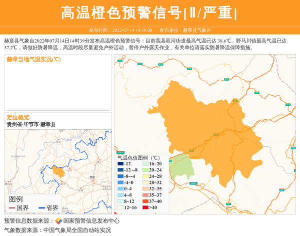赫章县气象台2022年07月14日14时39分发布高温橙色预警信号:目前我县双河街道最高气温已达 38.6℃、野马川镇最高气温已达37.2℃,请做好防暑降温,高温时段尽量避免户外活动,暂停户外露天作业,有关单位请落实防暑降温保障措施。 信息来源:国家预警信息发布中心; 发布单位:赫章县气象台。