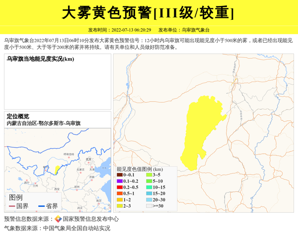 乌审旗气象台2022年07月13日06时10分发布大雾黄色预警信号:12小时内乌审旗可能出现能见度小于500米的雾,或者已经出现能见度小于500米、大于等于200米的雾并将持续。请有关单位和人员做好防范准备。 信息来源:国家预警信息发布中心; 发布单位:乌审旗气象台。