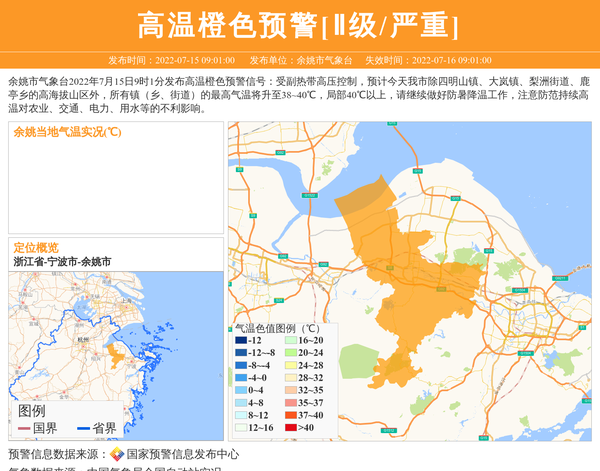 余姚市气象台2022年7月15日9时1分发布高温橙色预警信号:受副热带高压控制,预计今天我市除四明山镇、大岚镇、梨洲街道、鹿亭乡的高海拔山区外,所有镇(乡、街道)的最高气温将升至38~40℃,局部40℃以上,请继续做好防暑降温工作,注意防范持续高温对农业、交通、电力、用水等的不利影响。 信息来源:国家预警信息发布中心; 发布单位:余姚市气象台。