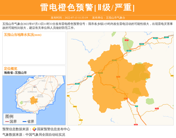 五指山市气象台2022年07月13日11时33分发布雷电橙色预警信号:我市各乡镇2小时内发生雷电活动的可能性很大,出现雷电灾害事故的可能性比较大,建议有关单位和人员做好防范工作。 信息来源:国家预警信息发布中心; 发布单位:五指山市气象台。
