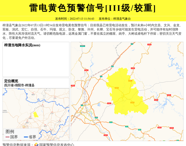 梓潼县气象台2022年07月13日11时54分发布雷电黄色预警信号:目前我县已有雷电活动发生,预计未来6小时内文昌、文兴、金龙、双板、演武、宏仁、自强、石牛、玛瑙、观义、卧龙、黎雅、许州、长卿、宝石等乡镇可能发生雷电活动,并可能伴有短时强降水、阵性大风等强对流天气。请切断危险电源,远离金属门窗,不要在孤立的棚屋、岗亭、大树或者电杆下停留;密切关注天气变化,尽量避免户外活动。 信息来源:国家预警信息发布中心; 发布单位:梓潼县气象台。