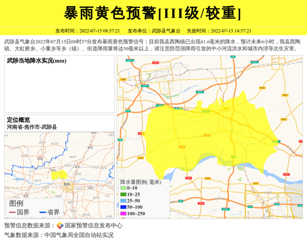 武陟县气象台2022年07月15日08时57分发布暴雨黄色预警信号:目前我县西陶镇已出现41.6毫米的降水,预计未来6小时,我县西陶镇、大虹桥乡、小董乡等乡(镇)、街道降雨量将达50毫米以上,请注意防范强降雨引发的中小河流洪水和城市内涝等次生灾害。 信息来源:国家预警信息发布中心; 发布单位:武陟县气象台。