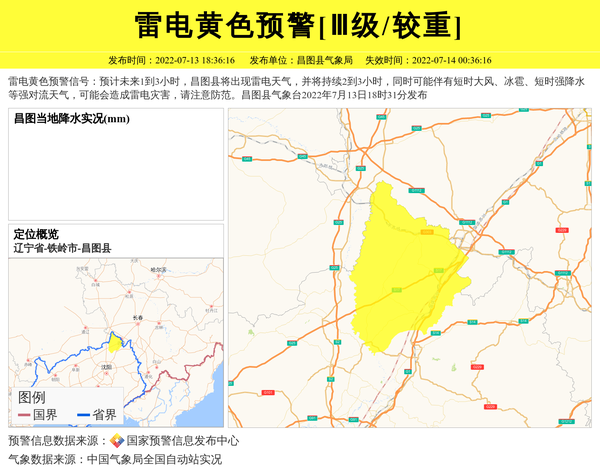雷电黄色预警信号:预计未来1到3小时,昌图县将出现雷电天气,并将持续2到3小时,同时可能伴有短时大风、冰雹、短时强降水等强对流天气,可能会造成雷电灾害,请注意防范。昌图县气象台2022年7月13日18时31分发布 信息来源:国家预警信息发布中心; 发布单位:昌图县气象局。