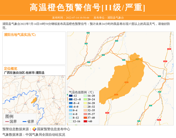 灌阳县气象台2022年7月14日10时58分继续发布高温橙色预警信号:预计未来24小时内我县将出现37度以上的高温天气,请做好防范。 信息来源:国家预警信息发布中心; 发布单位:灌阳县气象台。